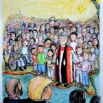 The story of British annexation, remembered as vai len, revolves around Bengkhuaia’s raid on the Alexandrapur tea estate and the capture of Mary Winchester (Zoluti). This moment is often presented as the turning point for Christianity’s entry into the Lushai Hills. Commemorative stones across Mizoram reinforce this link between Bengkhuaia, Zoluti, and the spread of Christianity. In Tlangrokhuma’s painting, the scene is rendered with overtly Christian symbolism: the sky opens, divine light falls upon the British officer, and the figures appear almost like angelic witnesses in a sacred drama.